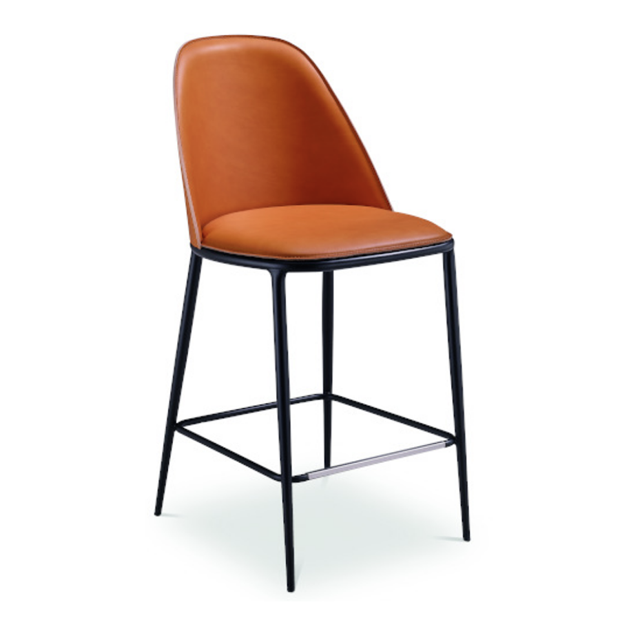 Sgabello con base a quattro gambe in acciaio o con base girevole e regolabile in altezza in metallo. Sedile e schienale rivestito in cuoio o cuoio toscano.