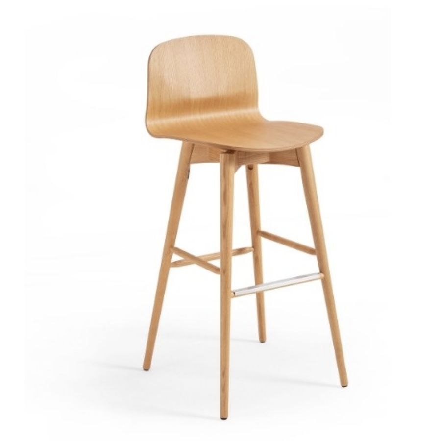 Sgabello con base a quattro gambe in legno e inserto in metallo verinciato. Sedile in legno. Lo sgabello Liù è disponibile nella versione da bancone da bar oppure sgabello da cucina, altezza 75 cm.