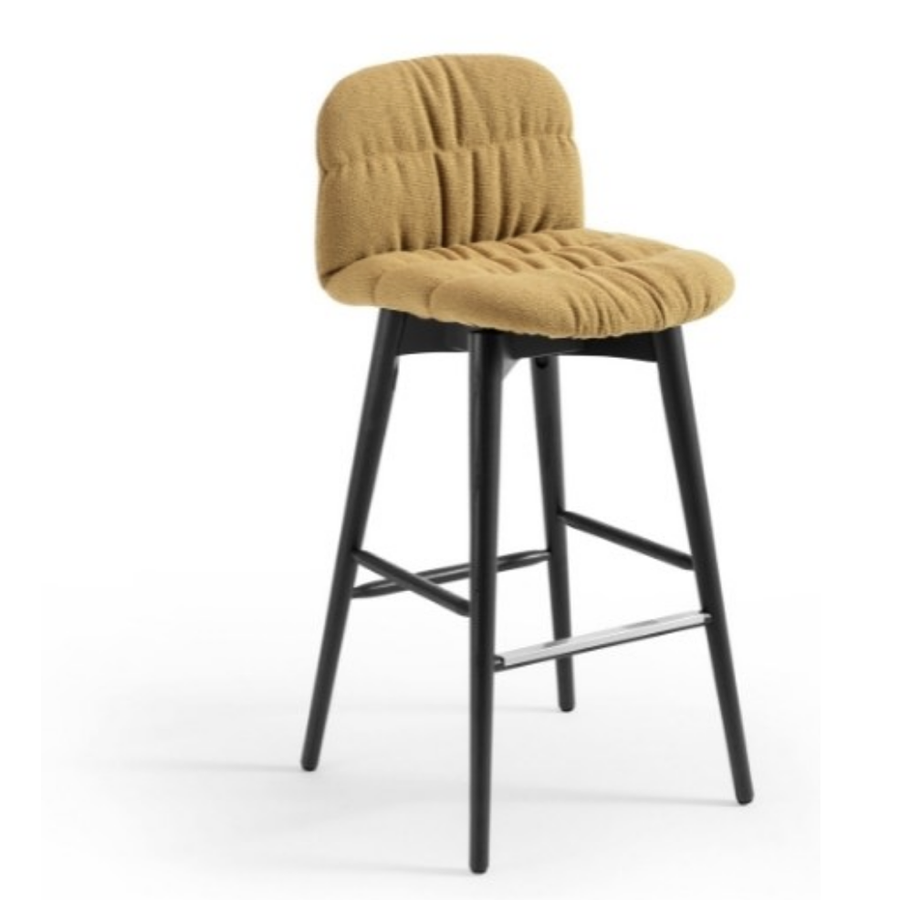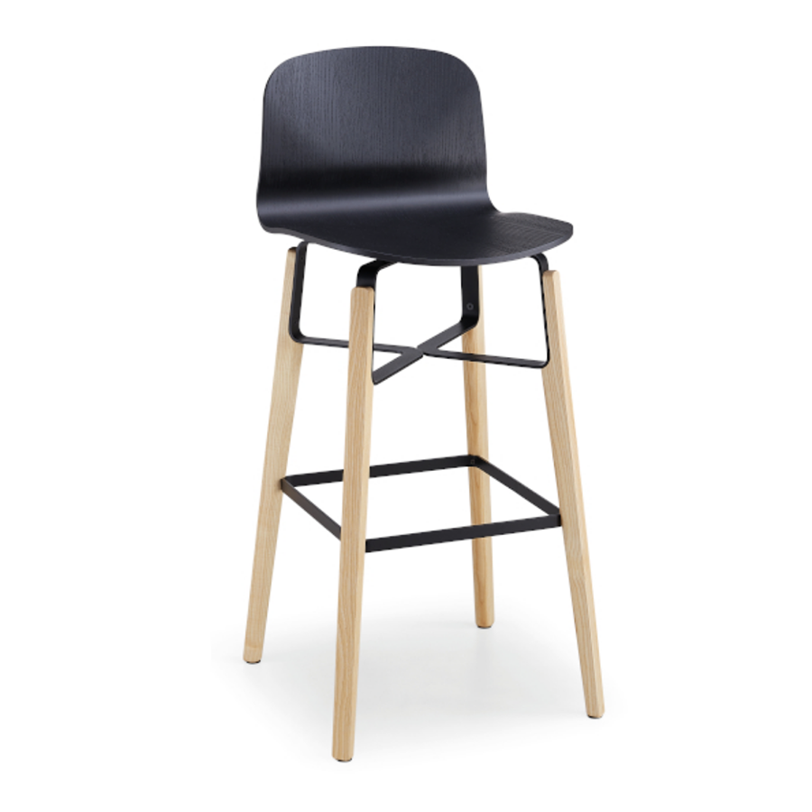 Sgabello con base a quattro gambe in legno e inserto in metallo verinciato. Sedile in legno. Lo sgabello Liù è disponibile nella versione da bancone da bar oppure sgabello da cucina.