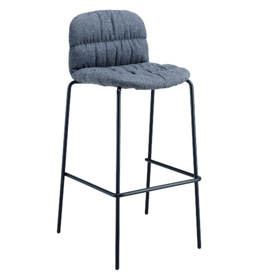 Liù Sgabello con struttura a quattro gambe in acciaio verniciato e scocca in legno. E' possibile scegliere anche la versione rivestita in tessuto oppure pelle con cuciture orizzontali o grinze e in aggiunta il retro in legno.