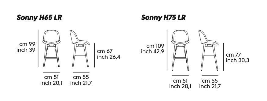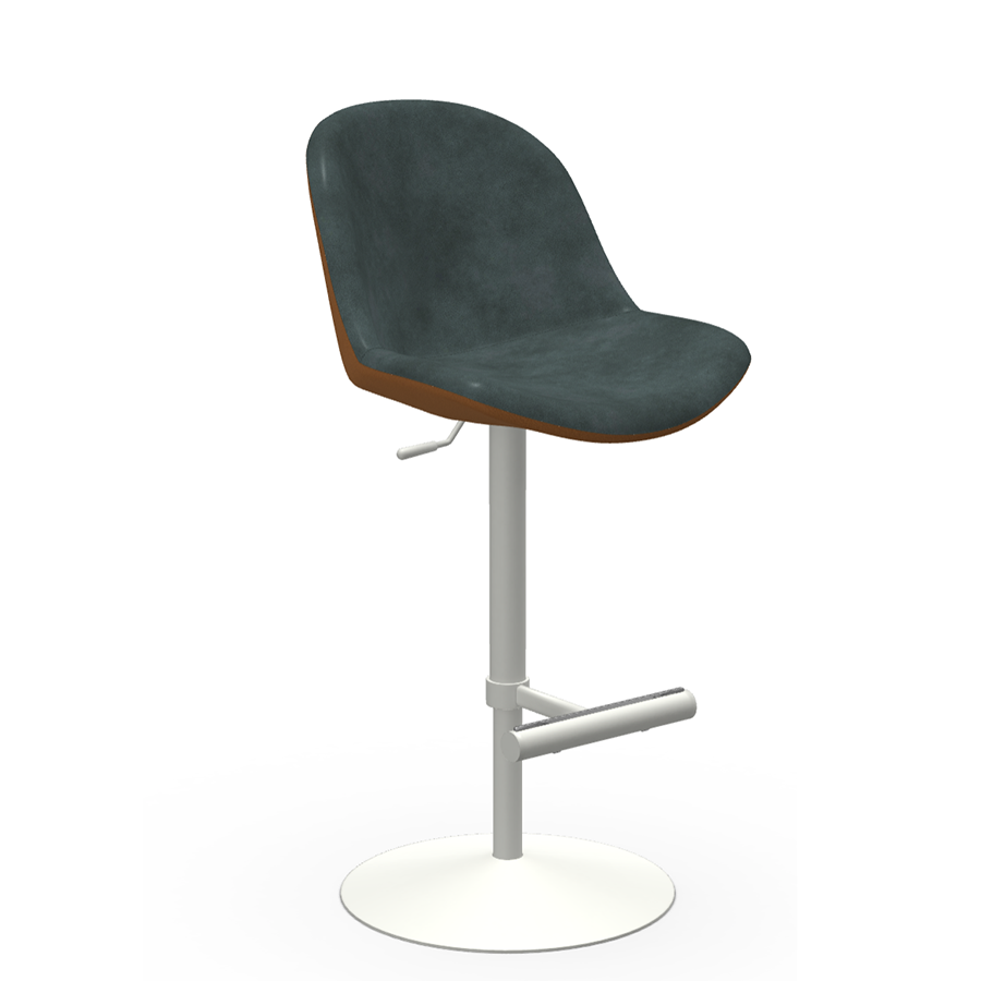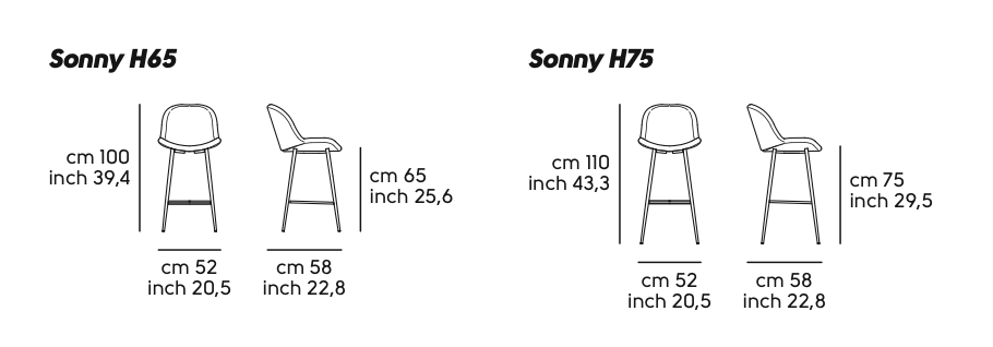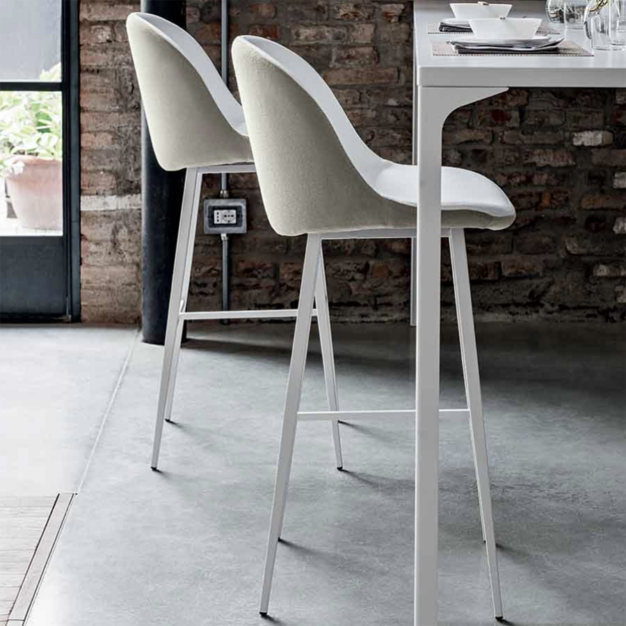 Sgabello fisso con base a quattro gambe in acciaio verniciato. Scocca rivestita in tessuto, pelle, ecopelle, tessuto cliente. Altezza seduta: 65 cm (25.6") o 75 cm (29.5").