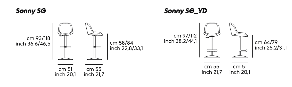 Versione girevole e regolabile in altezza con struttura in acciaio cromato o verniciato. Sedile e schienale rivestiti in tessuto, pelle o similpelle. Per questo modello è previsita la possibilità di scegliere una tappezzeria di due colori o due materiali diversi per fronte e retro, a scelta tra le opzioni della nostra cartella materiali.