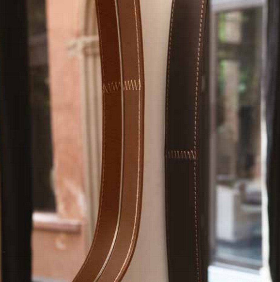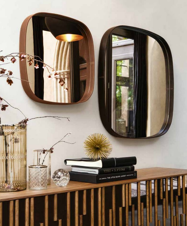 Specchiera Vega di Tonin Casa è uno specchio con cornice in cuoio.  vega è una specchiera sagomata bordate di vero cuoio in finitura testa di moro o cognac. Un design minimal e senza tempo.