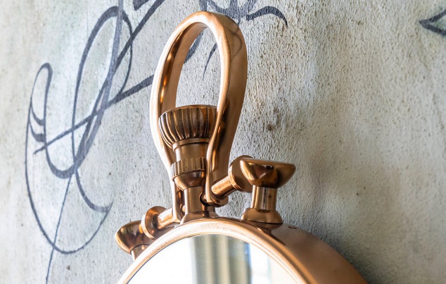 Specchio Cronografo di Cipì. Specchio in alluminio ed ottone con decorazione a Cronografo. Disponibile nel diametro 60 cm. Gancio Hang CP411 da acquistare separatamente. Disponibile nei colori Rose Gold o Cromo.