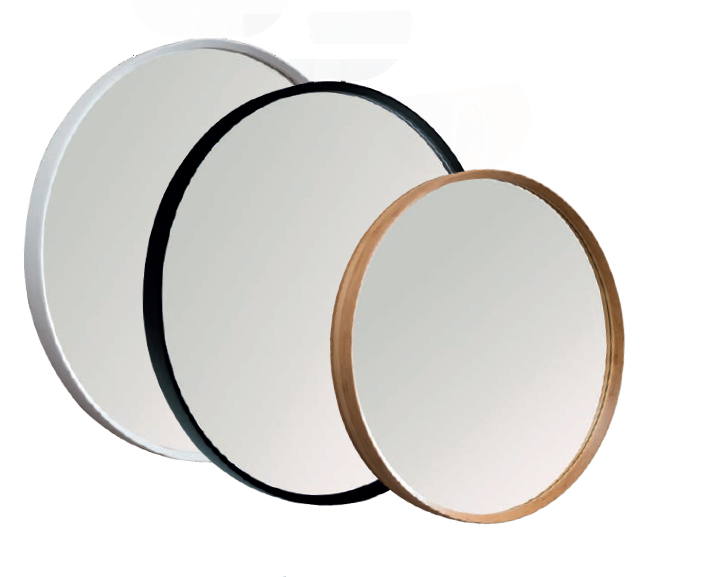 Specchio circolare con cornice realizzata in legno nelle varianti naturale, bianco opaco e nero. Appendibile tramite la corda nautica in cotone naturale ed il pomello in bamboo in dotazione.