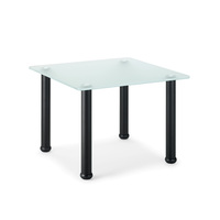 Tavolino attesa con gambe in acciaio con finitura verniciata a polveri epossidiche colore nero oppure cromata e vetro satinato.
