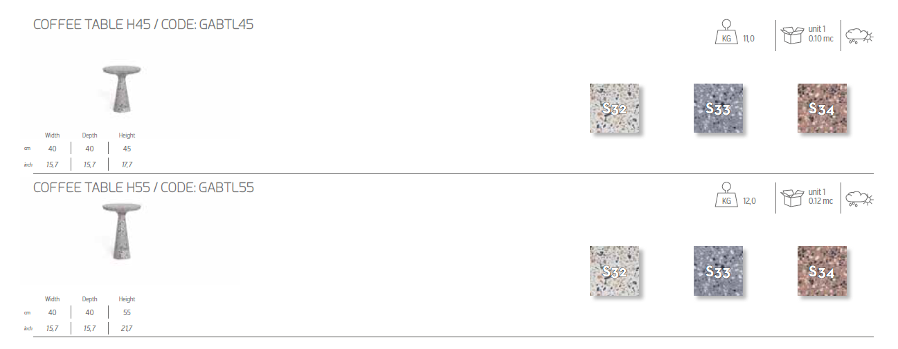 Il tavolino Gabri di Talenti è realizzato in terrazzo e è disponibile in varie colorazioni.