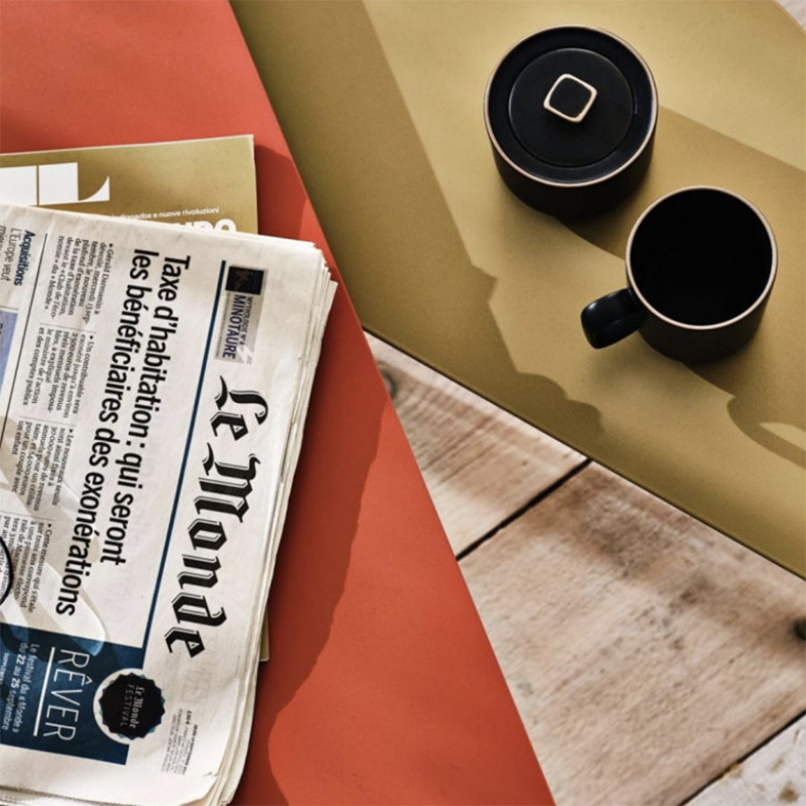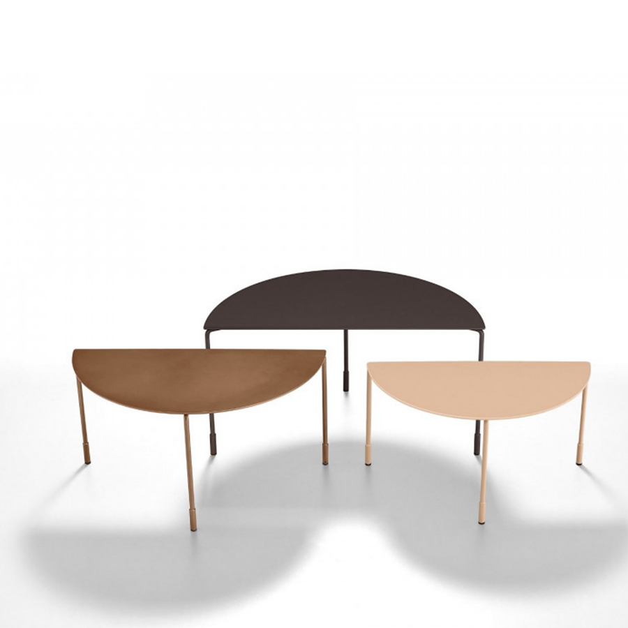 Tavolino Hoodi con gambe in metallo verniciato. Piano disponibile in metallo o rivestito in cuoio.