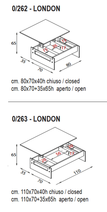 Tavolino London di Pezzani multifunzione con piano alzabile che nasconde un pratico contenitore. Realizzato in laminato Ecologico con fianchi in vetro trasparente temperato. Disponibile in più colori e due dimensioni. Design raffinato e prezioso per il living.