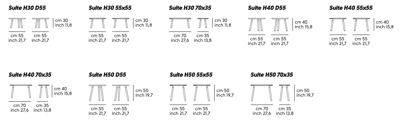 Oltre alla versione quadrata 55x55, è disponibile quella rettangolare 70x35. Le altezze disponibili per entrambe le versioni sono H30, H40 e H50.