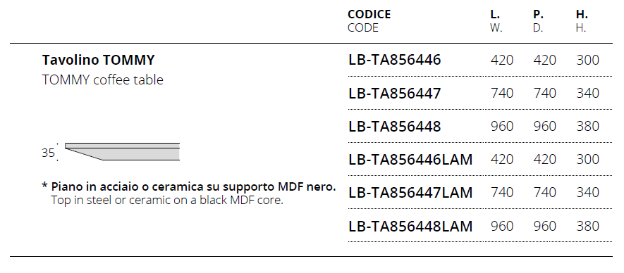 Tavolino Tommy di Altacorte con basamento in acciaio e piano in acciaio o in ceramica. Famiglia di tavolini dal design accattivante e molto versatile, disponibile in tre dimensioni, vari materiali e moltissimi colori.