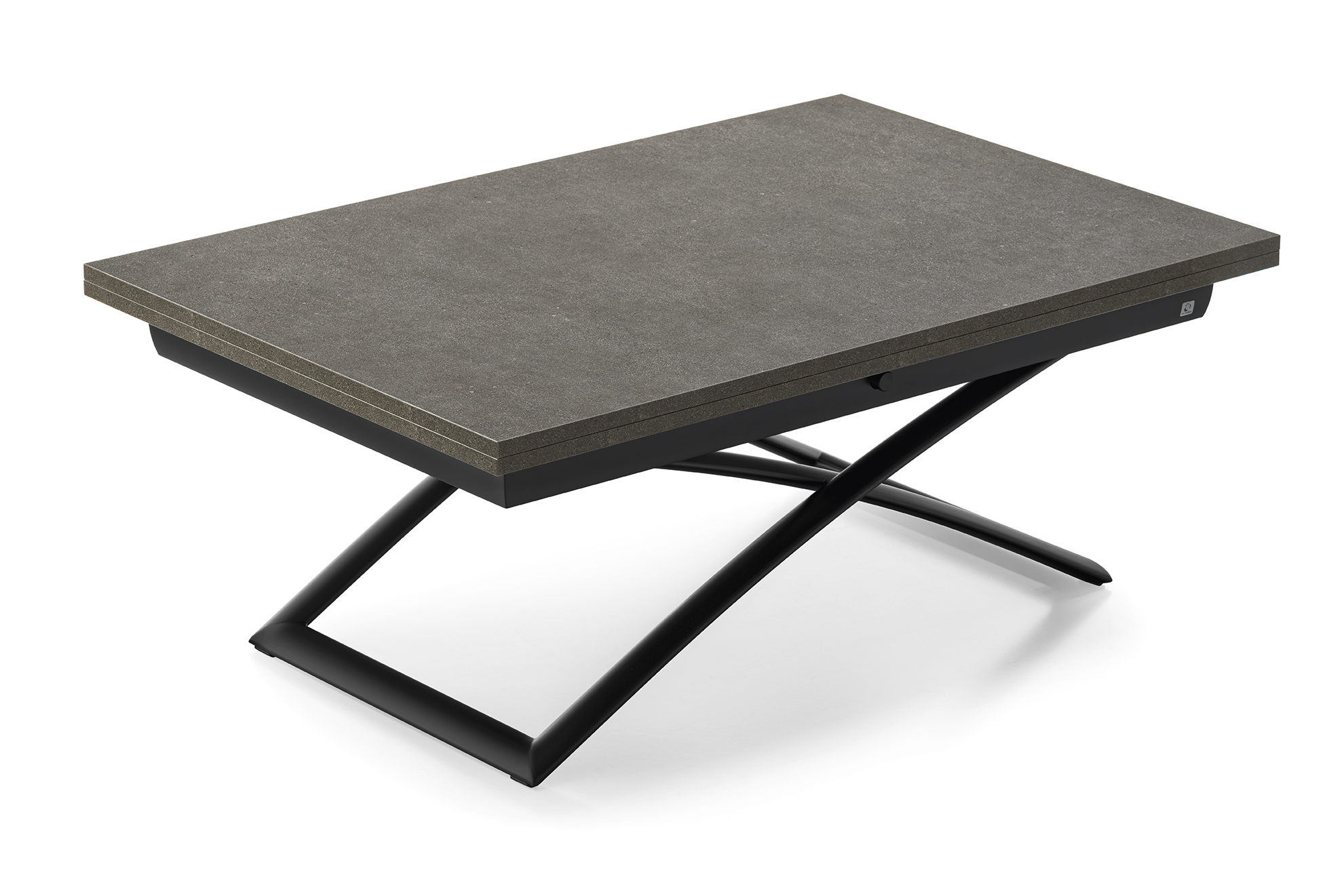 Tavolino trasformabile Magic-J di Connubia con basamento in metallo, cassonetto in laccato e piano e allunghe in nobilitato. Il tavolino trasformabile Magic-J è regolabile in sette altezze diverse e il piano in legno è raddoppiabile a libro.
