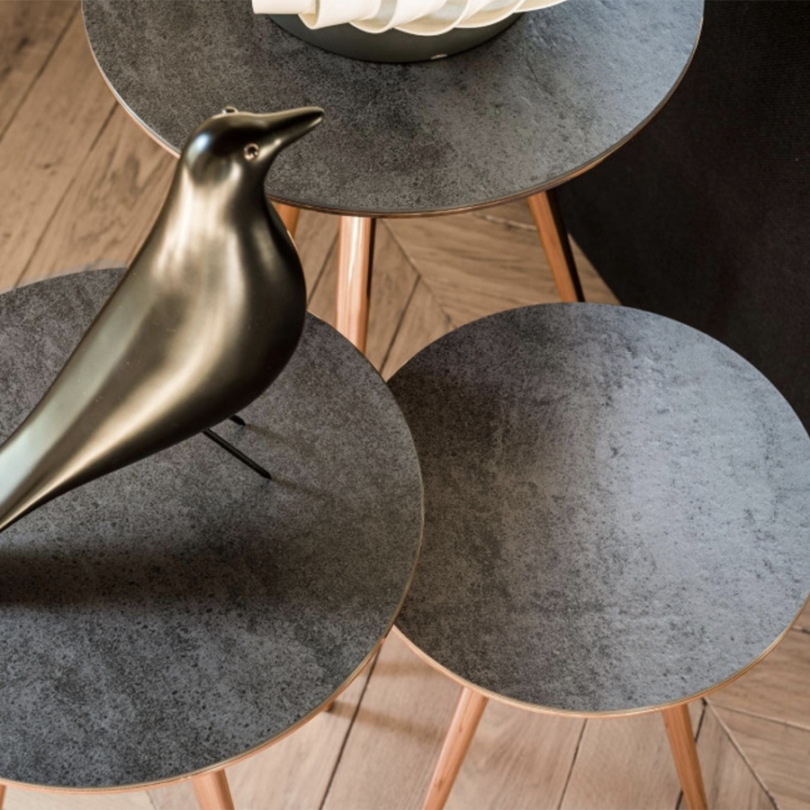 Coffee table Trip con basamento a tre gambe in metallo.