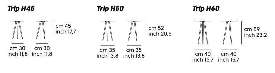 Disponibile in tre diverse dimensioni: H45 cm Ø30, H50 cm Ø35, H60 cm Ø40.