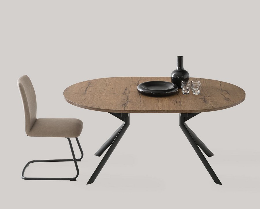 Base centrale in metallo fissa con quattro gambe inclinate a sezione ellittica e meccanismo di apertura a libro con allunga centrale in tinta con la base.