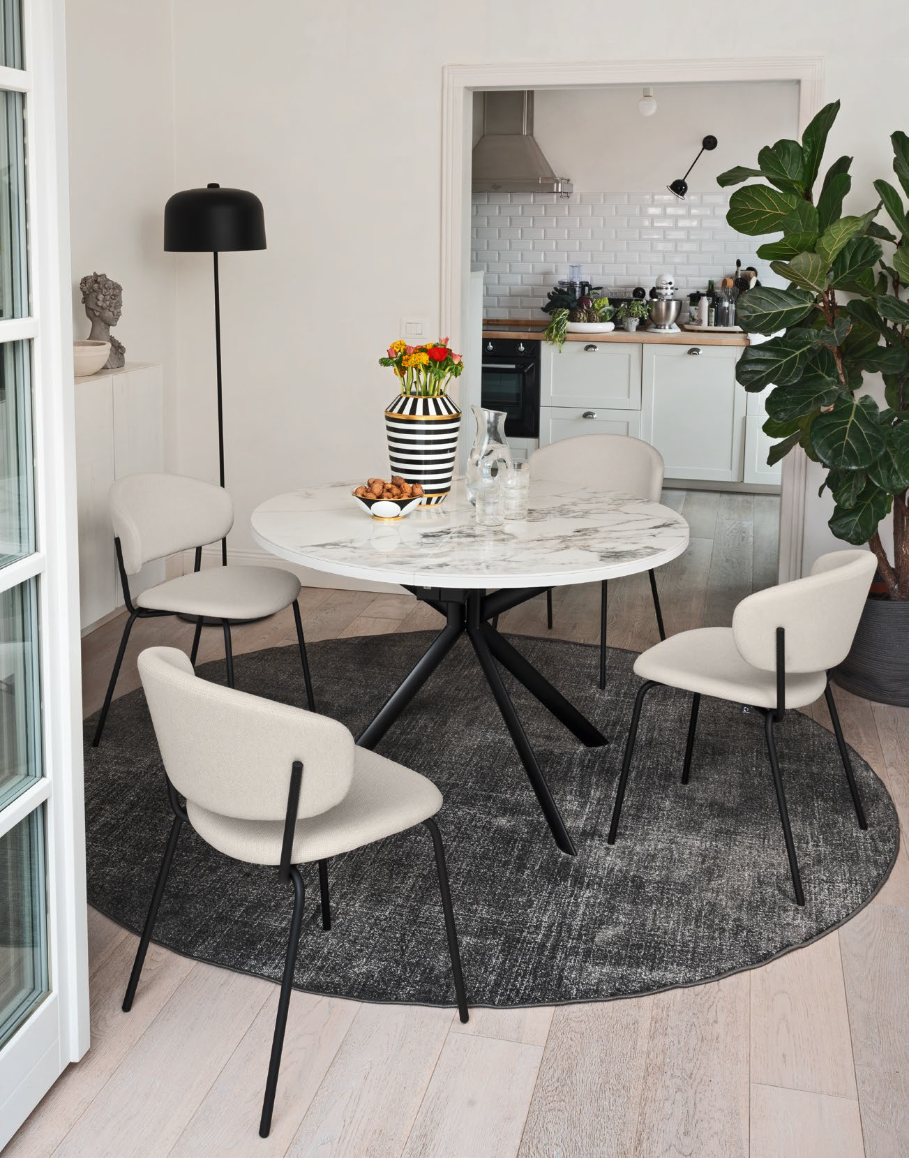 Tavolo allungabile Giove di Connubia, basamento in metallo con piano tondo in legno, legno-ceramica o legno-vetro.