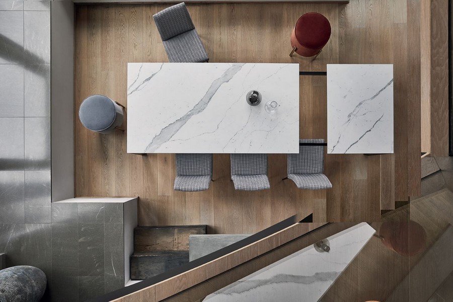 Tavolo allungabile Mirage di Bontempi. Le  sfaccettature a taglio di diamante caratterizzano le gambe del tavolo Mirage, donano leggerezza ed eleganza e si combinano perfettamente alla stabilità e robustezza dell'alluminio, rendendolo un pezzo unico nel suo genere.