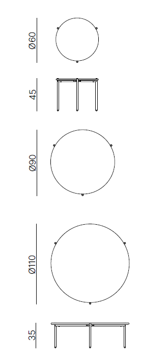 Tre tavoli bassi tondi in ferro zincato e verniciato, progettato per garantire una lunga durata all’esterno.