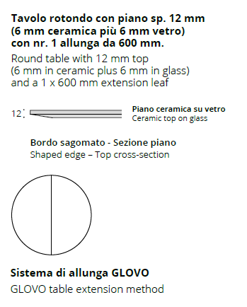 • Tavolo rotondo con piano sp. 1,2 cm (6 mm ceramica più 6 mm vetro) con nr. 1 allunga da 60 cm. Con sistema di allunga Glovo.