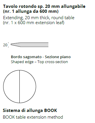 • Tavolo rotondo allungabile (1 allunga da 60 cm) sp. 2 cm. Il sistema di apertura Book permette l'estensione centralmente di 60 cm in modo facile e veloce.