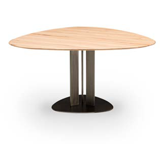 Tavolo allungabile o fisso Clark di Altacorte con basamento in acciaio. Nella versione allungabile da chiuso è tondo, mentre aperto è ellittico, invece nella versione fissa è di forma trilobata.