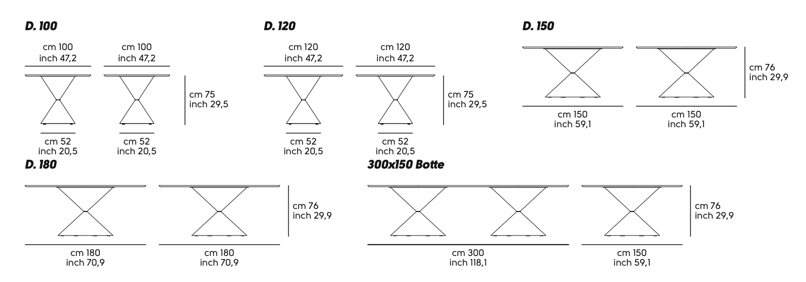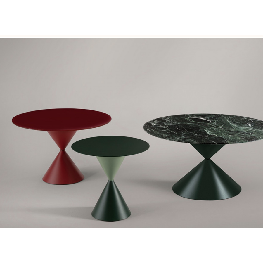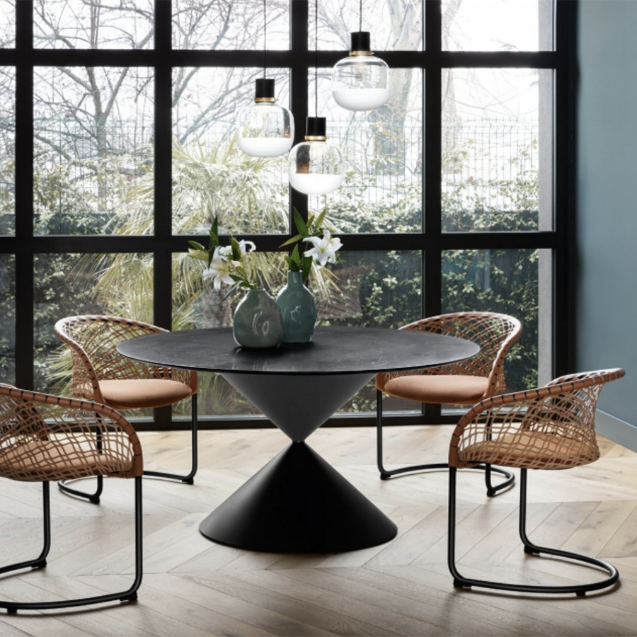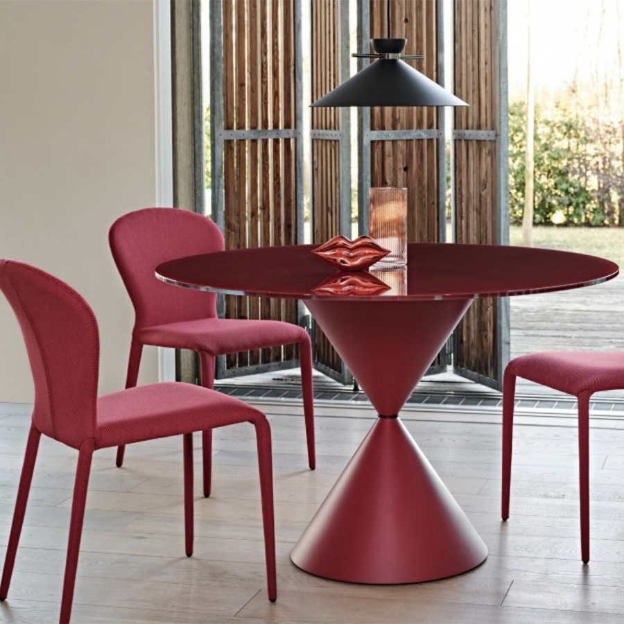 Tavolo tondo fisso con base in metallo o legno. La versione in metallo è disponibile a tinta unita o bicolore. Piano in cristalceramica, legno o marmo. Inserto disponibile anche in metallo M4.
