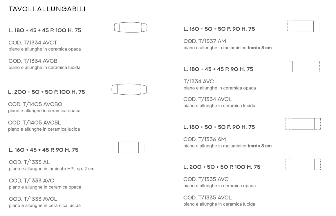 Tavolo allungabile con basamento in metallo verniciato in varie finiture e piano e allunghe in diversi materiali e finiture.