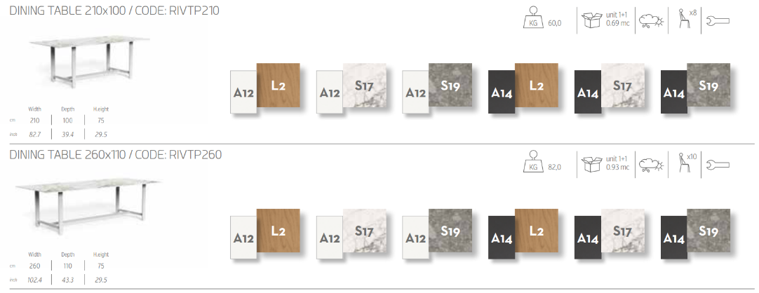 Il Tavolo da Pranzo Riviera è l’elemento distintivo per il proprio living all’esterno. Moderno e raffinato, coniuga la scelta di materiali resistenti agli agenti atmosferici al design intramontabile ed elegante. Realizzato in alluminio nella struttura e in gres porcellanato nel pianale, materiali inattaccabili dagli agenti atmosferici e inalterabili dai raggi UV, è l'ideale per creare un living conviviale dallo stile deciso e curato. Essenziale e concreto nelle linee, ma ricercato ed elegante nei materiali, il Tavolo da Pranzo Riviera è ideale per godere al meglio il proprio living outdoor. Il Tavolo da Pranzo 210×100 della collezione Riviera offre la possibilità di accogliere nel proprio living all’aperto fino ad 8 persone, mentre nella versione 260x110 fino a 10.