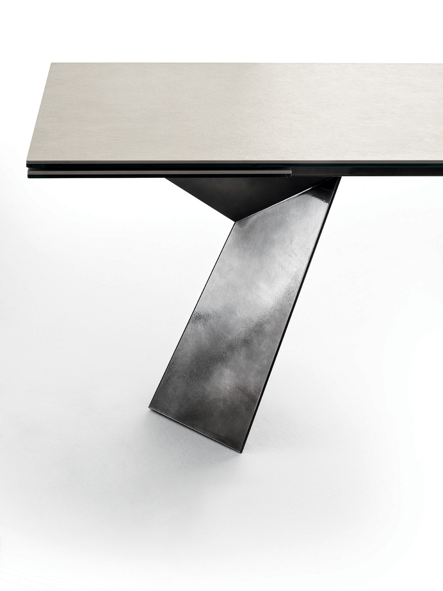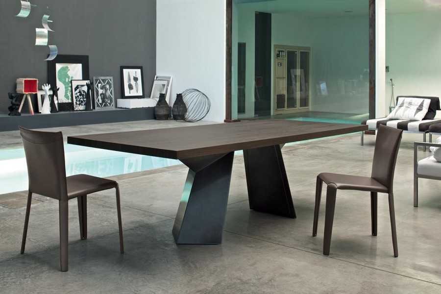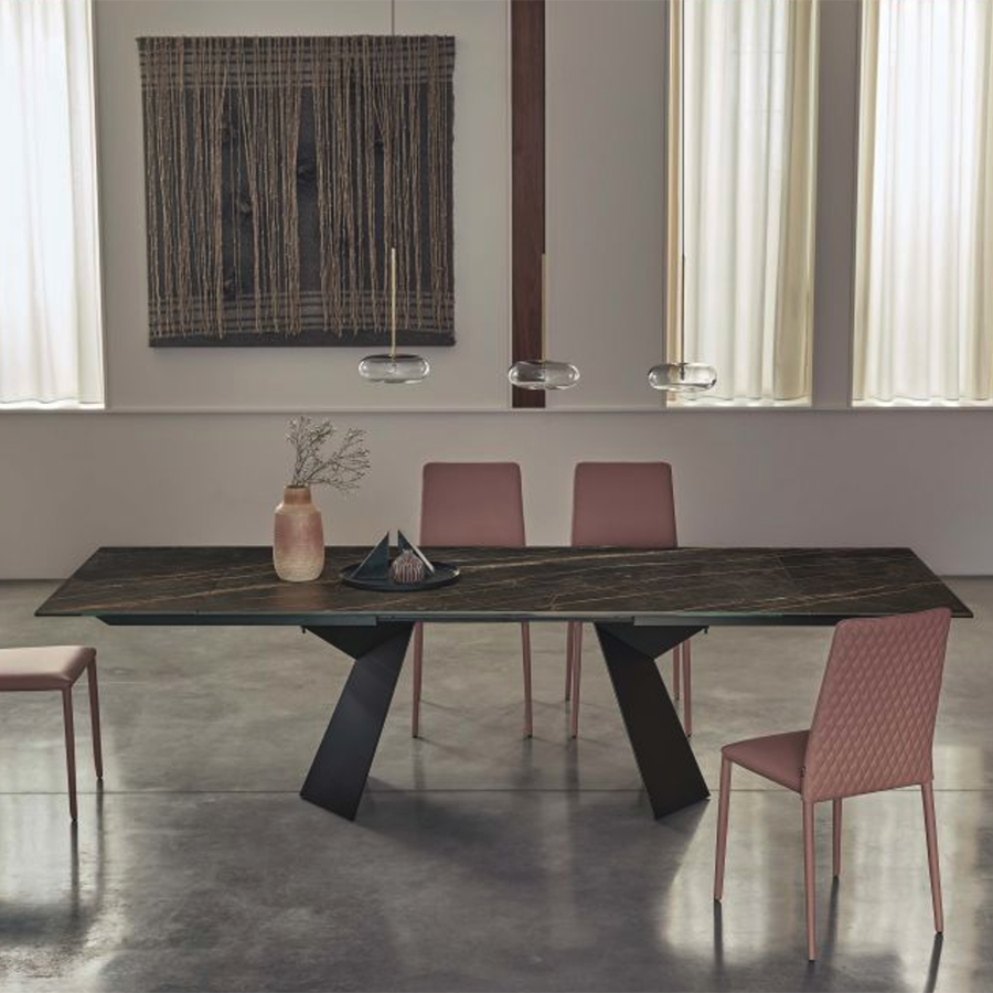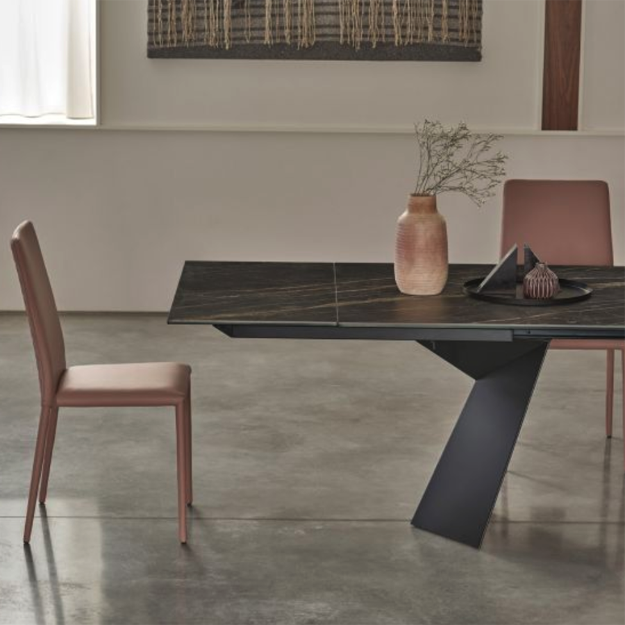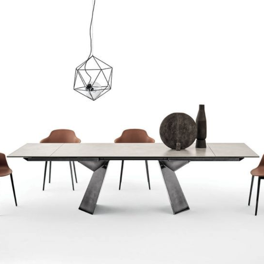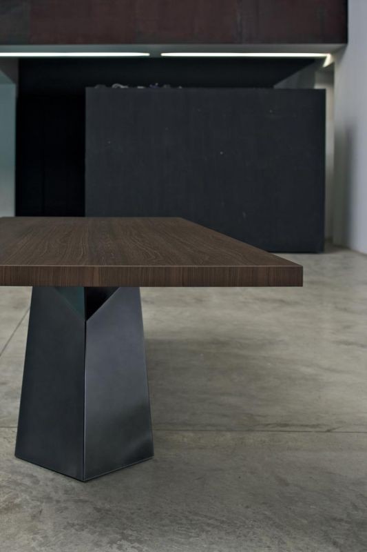 Tavolo moderno di design, l'imponente basamento in acciaio dalle forme geometriche rende il tavolo FIANDRE particolare ed elegante per arredare soggiorni con grande stile. Il piano è disponibile in numerose finiture.