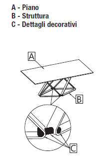 La struttura è caratterizzata da linee geometriche che riprendono il tema del tavolo con gambe incrociate, reinterpretandolo con leggerezza e con dettagli preziosi che ne sottolineano la forte personalità. In acciaio laccato, può essere declinata in diverse finiture che vanno dall'ottone anticato all'oro passando per bianco e nero, opaco oppure lucido.