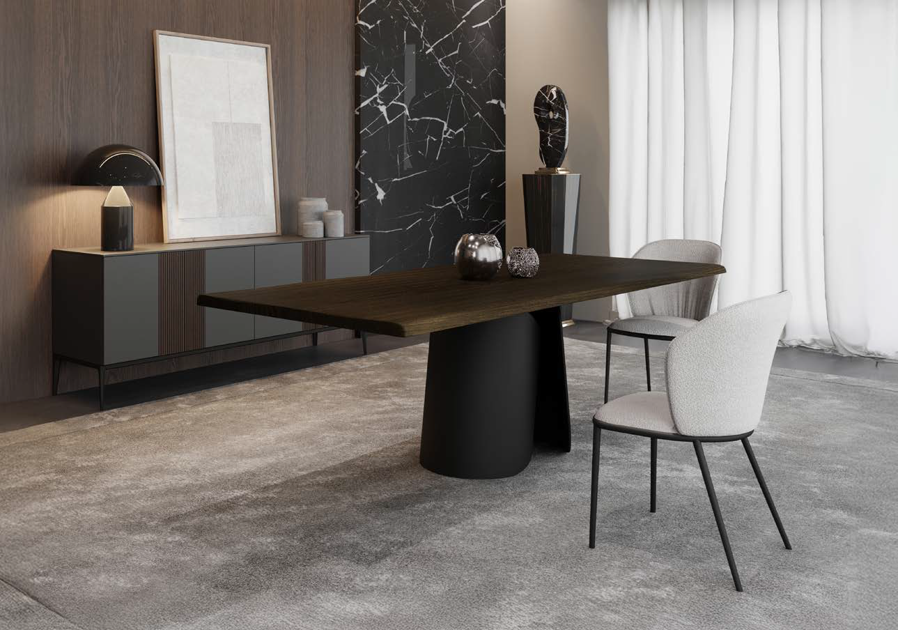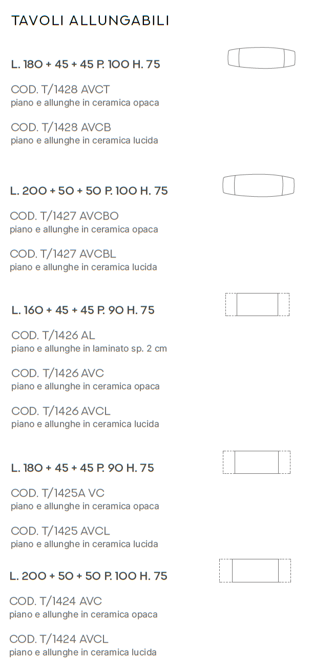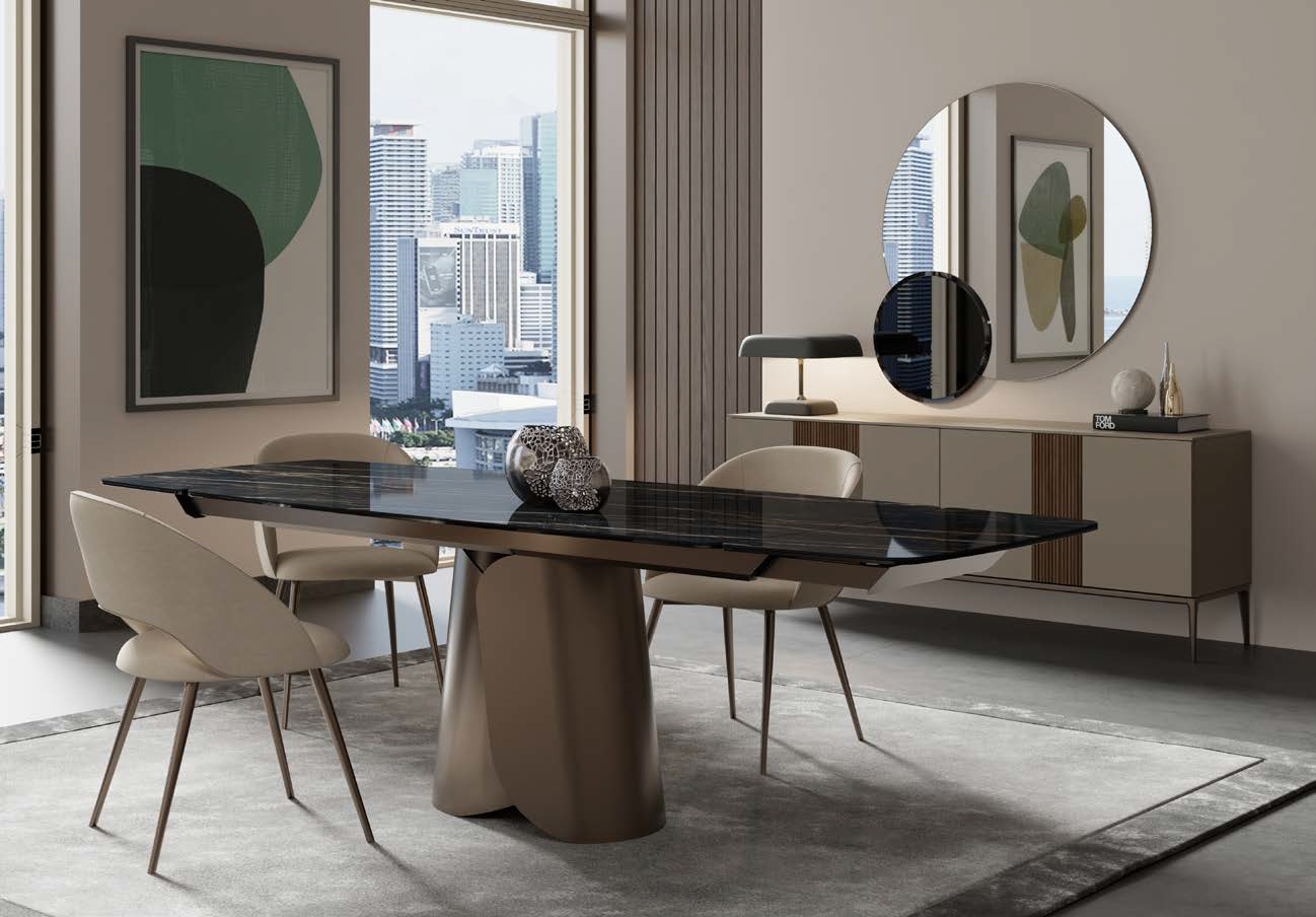 Tavolo fisso o allungabile con basamento in metallo verniciato in varie finiture e piano e allunghe in diversi materiali e finiture.
