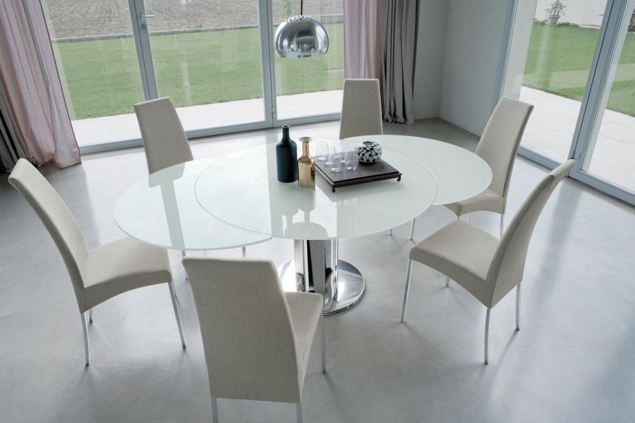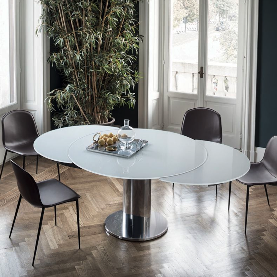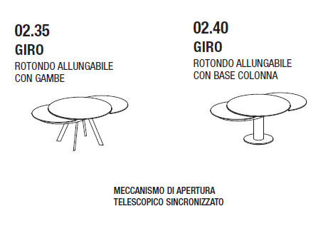 Tavolo Giro Bontempi rotondo allungabile, con una semplice rotazione del piano si trasforma in un meraviglioso tavolo elittico, capace di ospitare fino a dieci posti a tavola. Le allunghe sono in cristallo nella stessa finitura del piano e si posizionano grazie ad un innovativo sistema di apertura telescopio sincronizzato ( vedi video ).