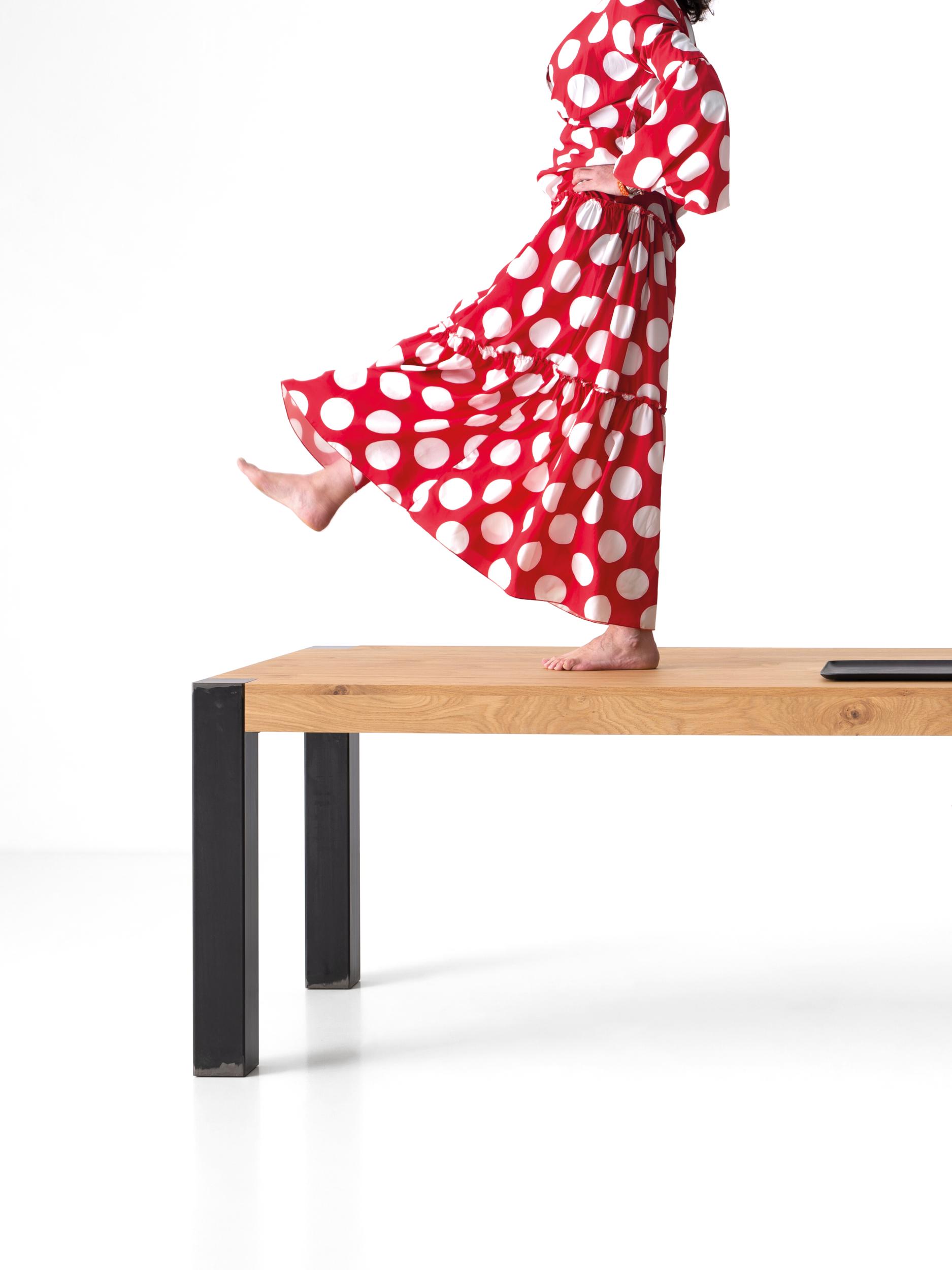 Il tavolo Tola è il ritorno al materiale naturale con il design e la tecnica Pointhouse; la ricerca di una finitura piacevole al tatto visibilmente delicata e ricercata nelle fiammature del legno.