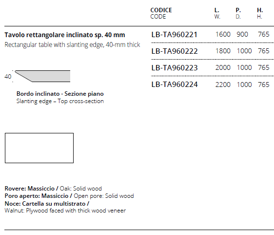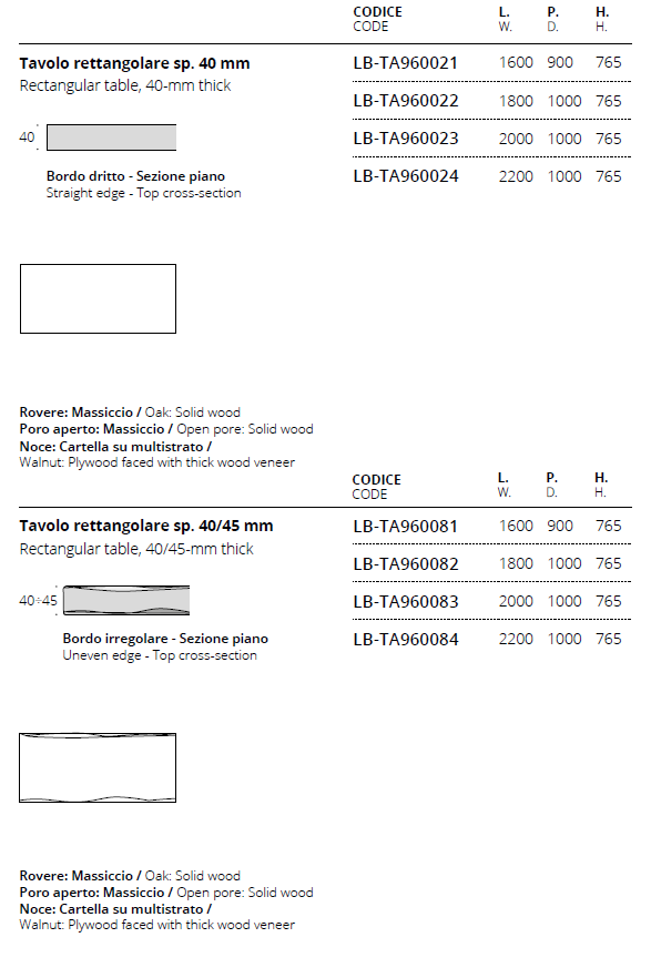 • I piani in ceramica e i piani in ceramica con inserto in legno fossile sono disponibili solo per i modelli Tavolo ovalizzato sp. 35 mm e Tavolo rettangolare sp. 35 mm. ( Il piano di questi due modelli è disponibile solo in queste finiture).
