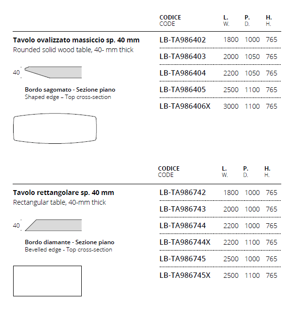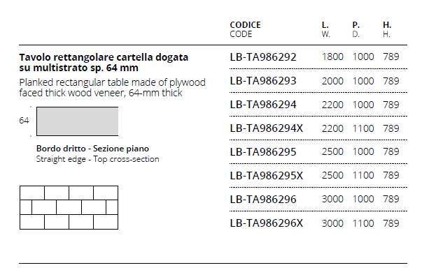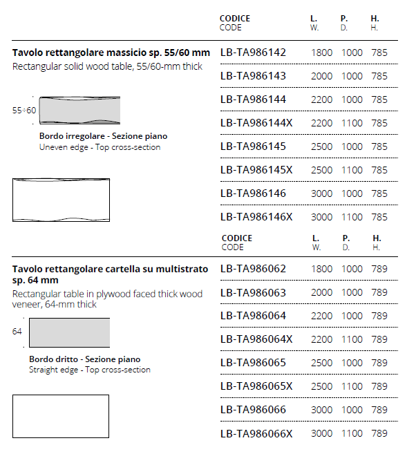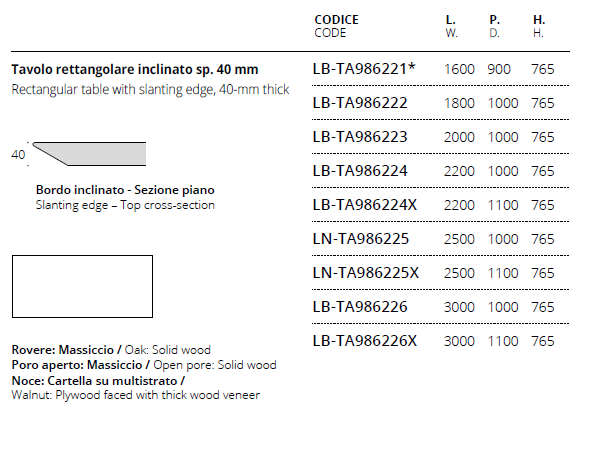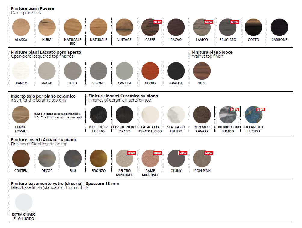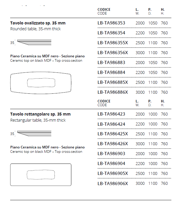 • I piani in ceramica e i piani in ceramica con inserto in legno fossile sono disponibili solo per i modelli Tavolo ovalizzato sp. 35 mm e Tavolo rettangolare sp. 35 mm. ( Il piano di questi due modelli è disponibile solo in queste finiture).