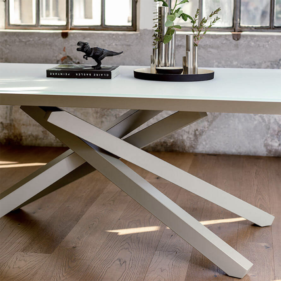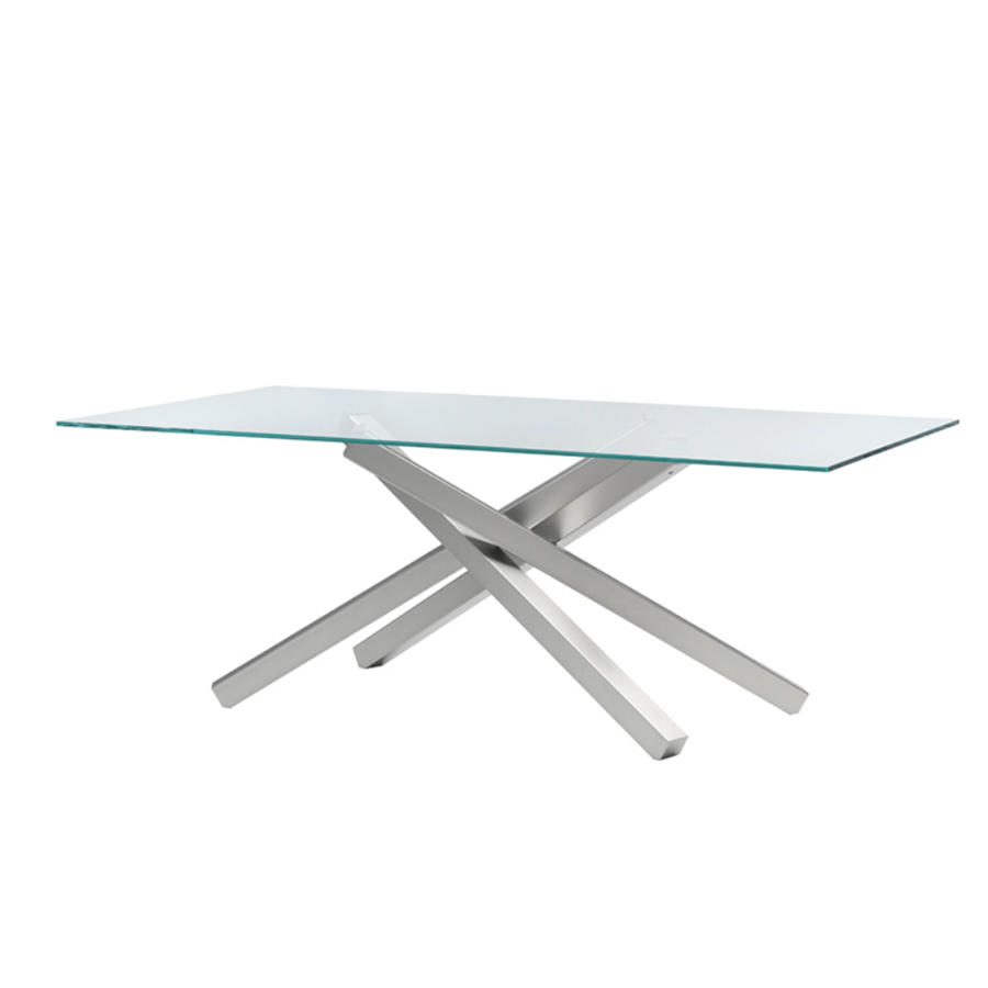Tavolo fisso Pechino con base in metallo e piano in vetro, legno impiallacciato o legno massello. Disponibile anche in versione allungabile.