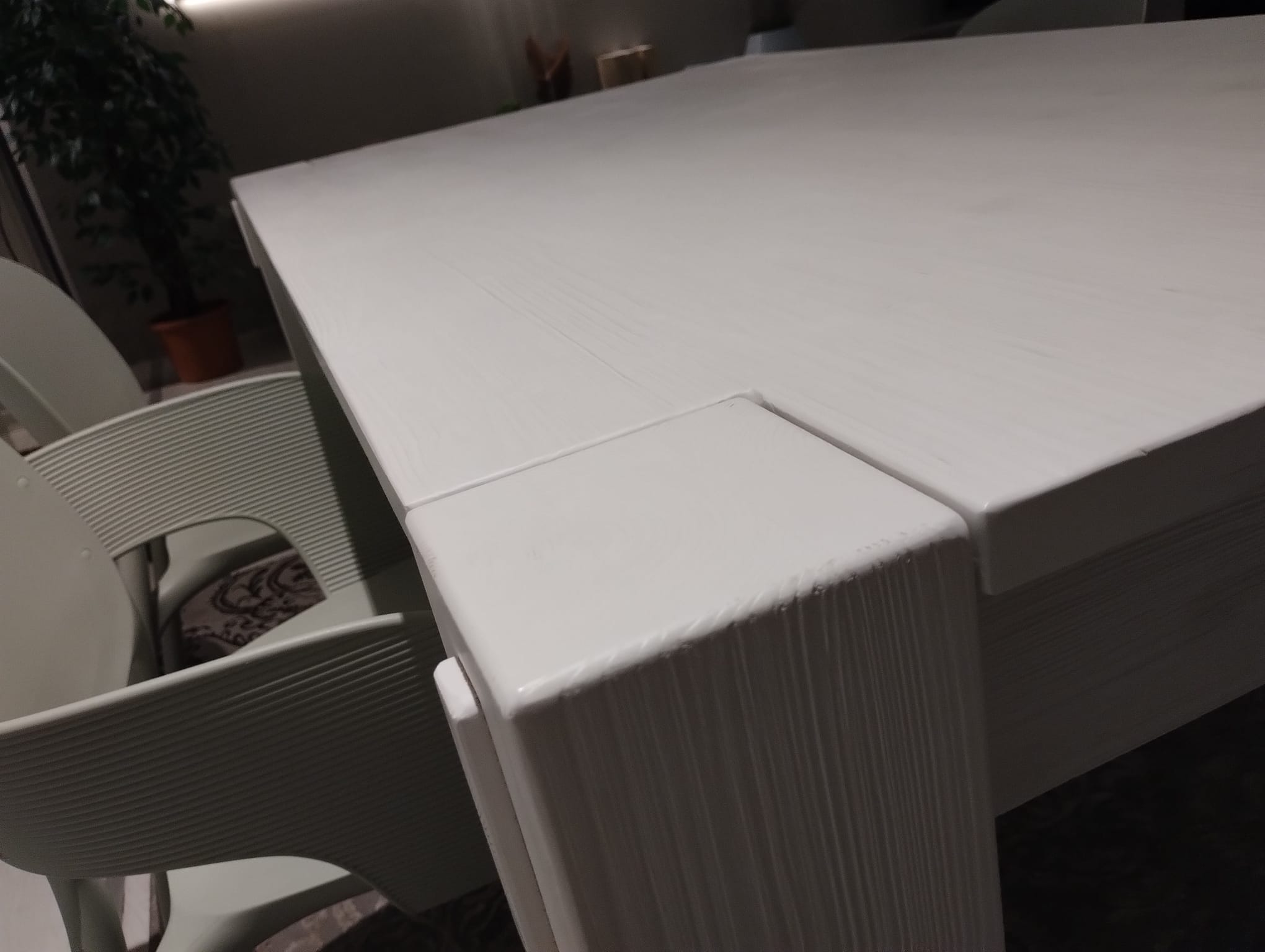 Tavolo allungabile Stoccolma di Altacorte interamente in legno massello allungabile in 2 step con allunghe da 45 cm contenute nel tavolo. Disponibile in Abete bianco.