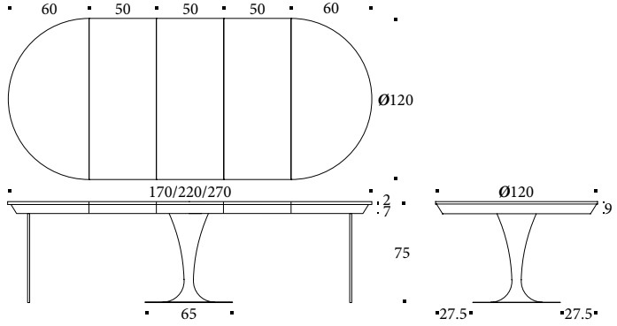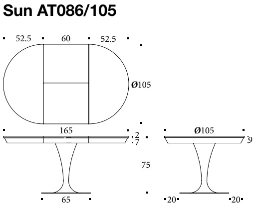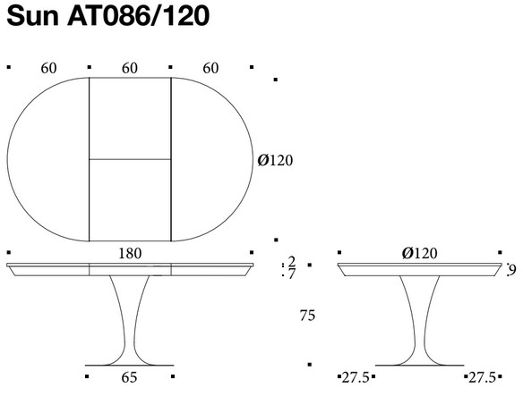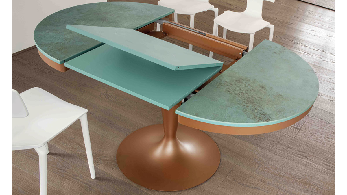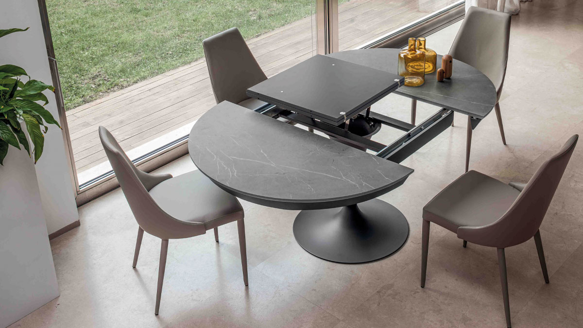 Sun, nella sua forma a calice, evoca una coppa di champagne: in effetti questo tavolo ha tutta l’aria di voler festeggiare il connubio vincente tra raffinatezza e sinuosità di un design evoluto e la ricercatezza del materiale del piano in ceramica. Domina al centro della sala, accogliente nella sua rotondità, diventa ellittico per offrirsi nelle sue performaces dimensionali.