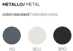 La verniciatura dei metalli è effettuata con polveri termoindurenti poliestere Qualicoat classe 1 e classe 2. Possibilità di trattamento aggiuntivo prima della finitura con applicazione fondo espossidico.