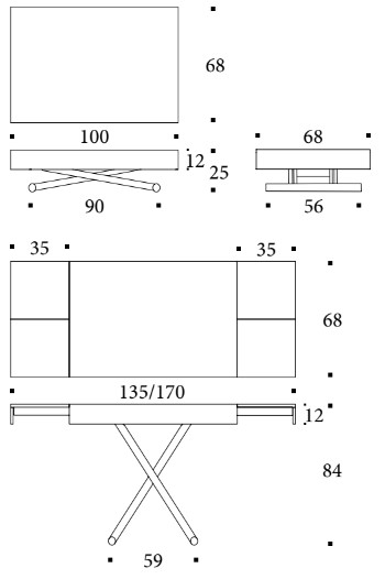 Tavolino trasformabile in tavolo da pranzo Compact di Altacom. Base in metallo, meccanismo a gas, regolabile in altezza al millimetro da 25 cm a 84 cm, piano rettangolare in nobilitato, legno o effetto malta. Con 2 prolunghe interne a libro. Ruote a scomparsa.