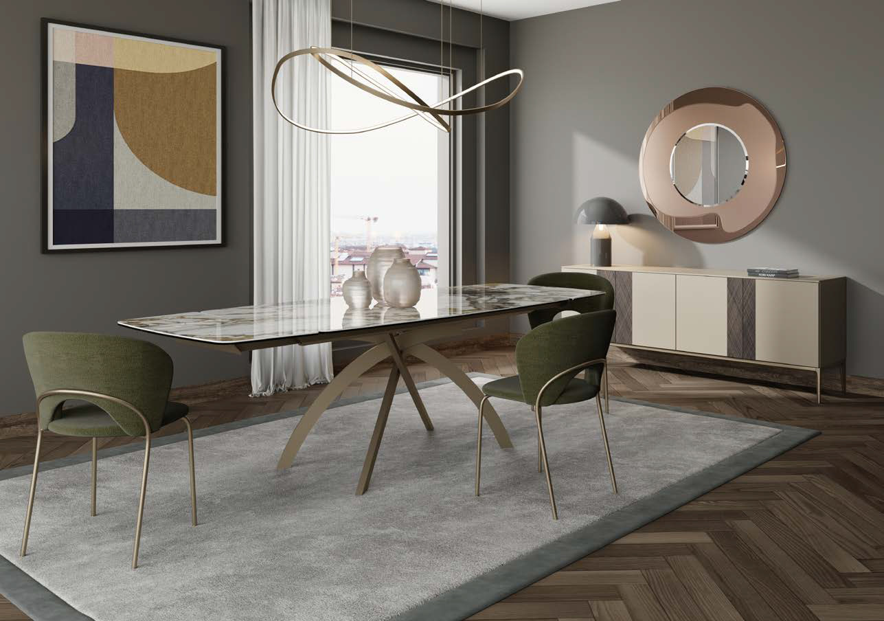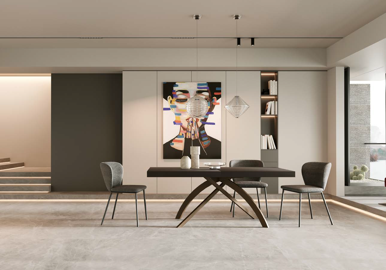 Tavolo allungabile con basamento in metallo verniciato in varie finiture e piano e allunghe in diversi materiali e finiture.