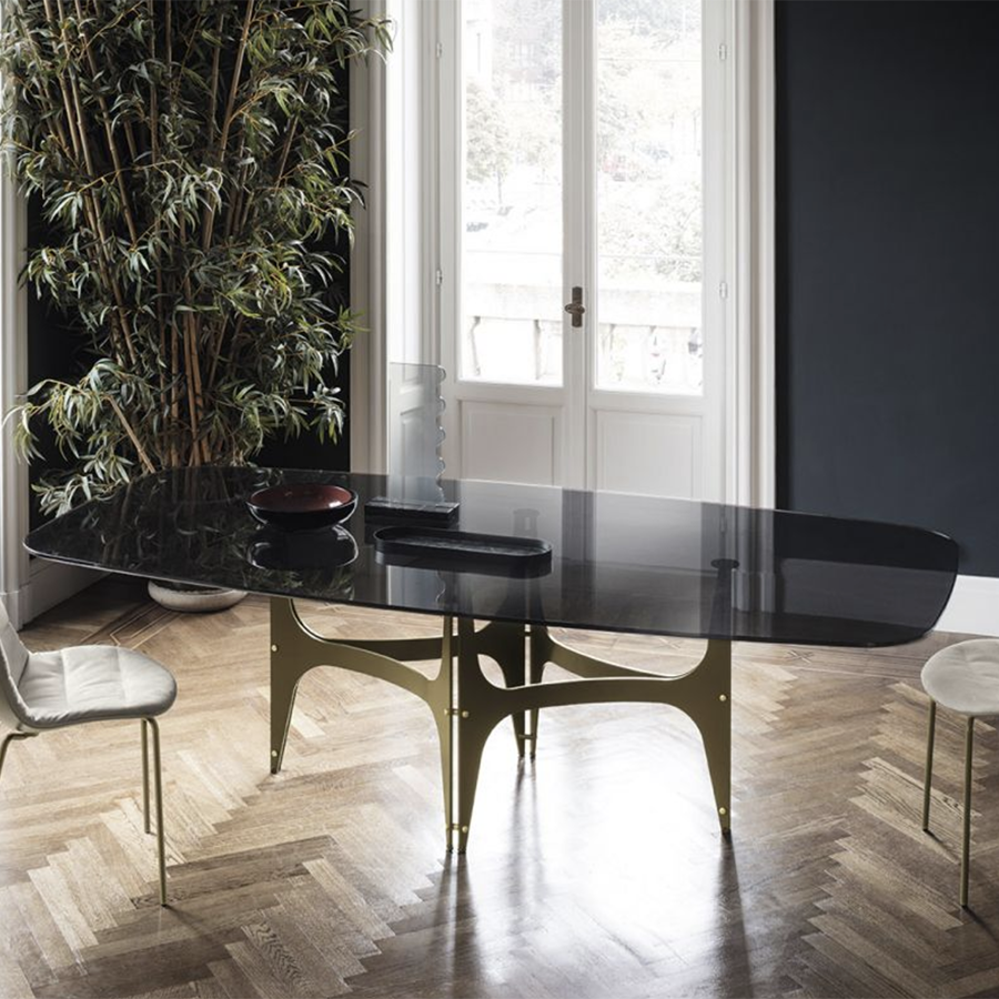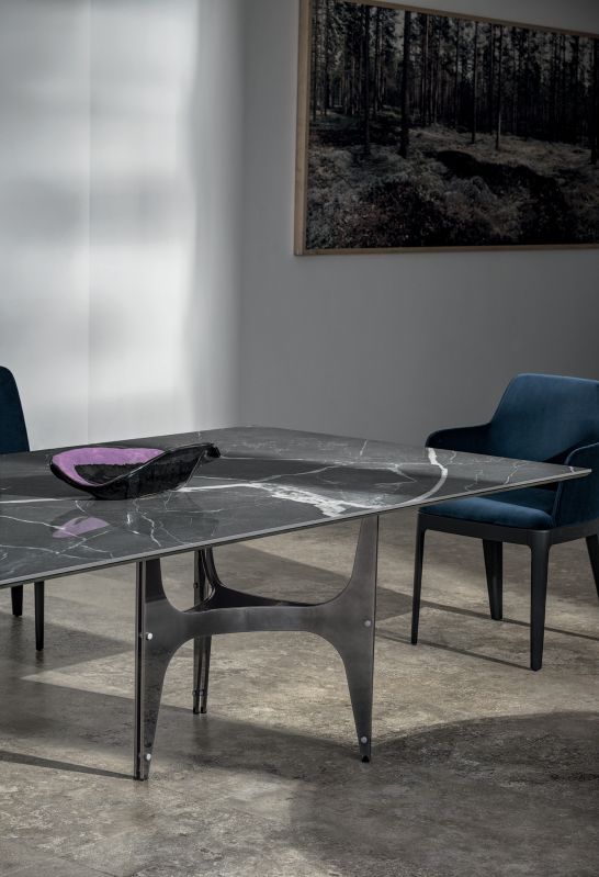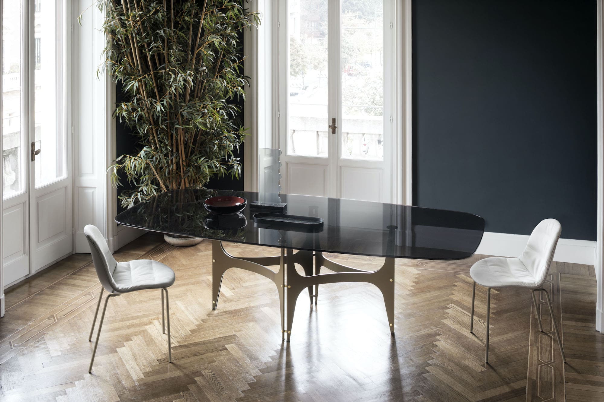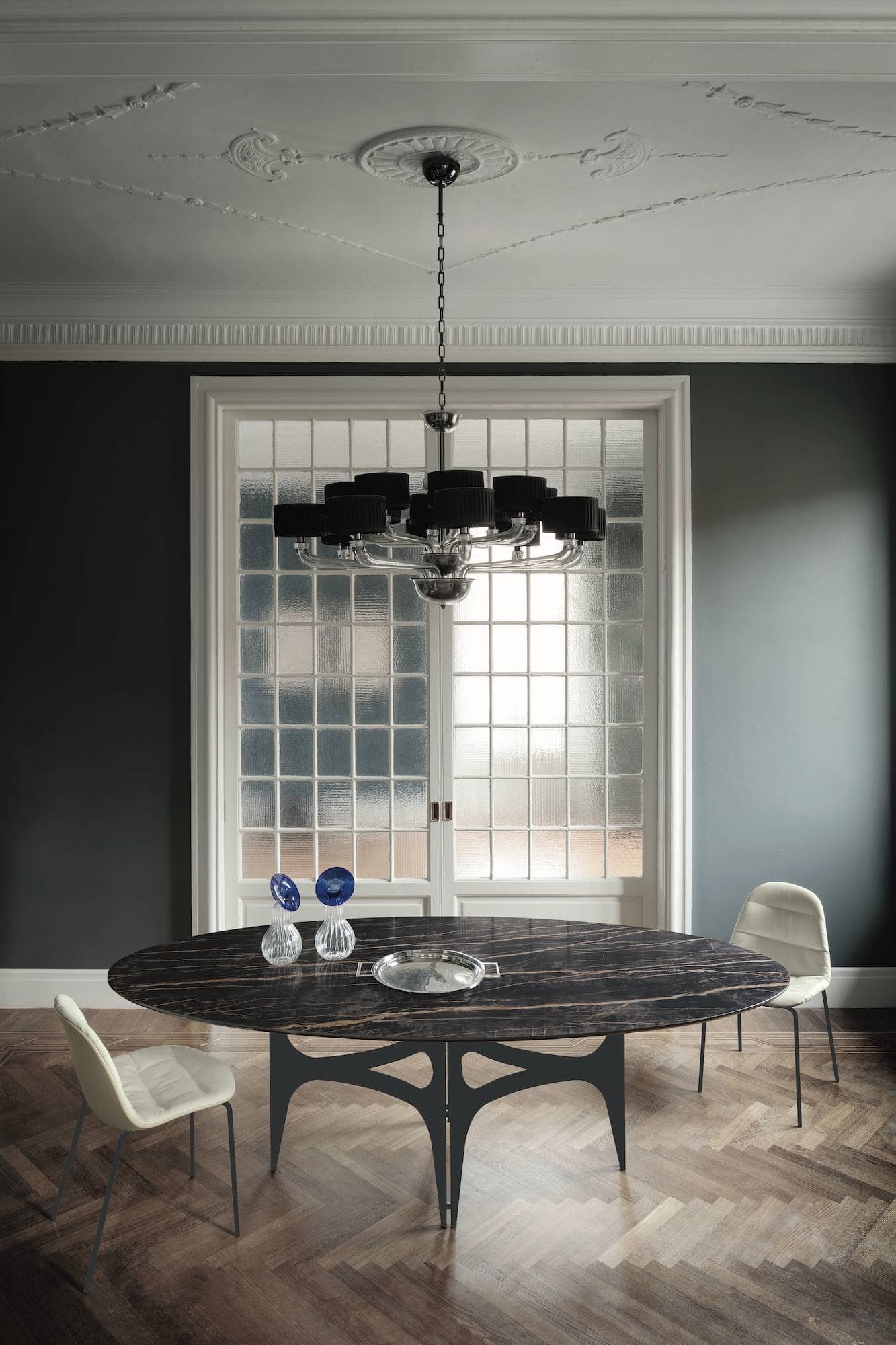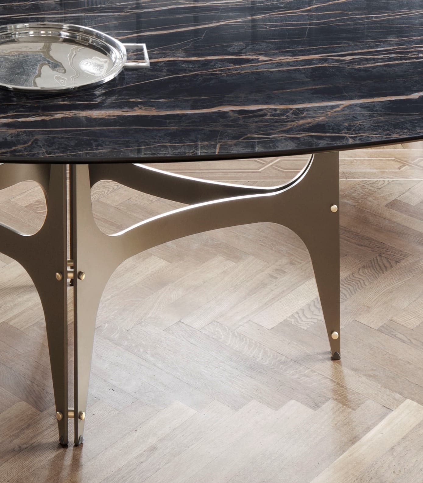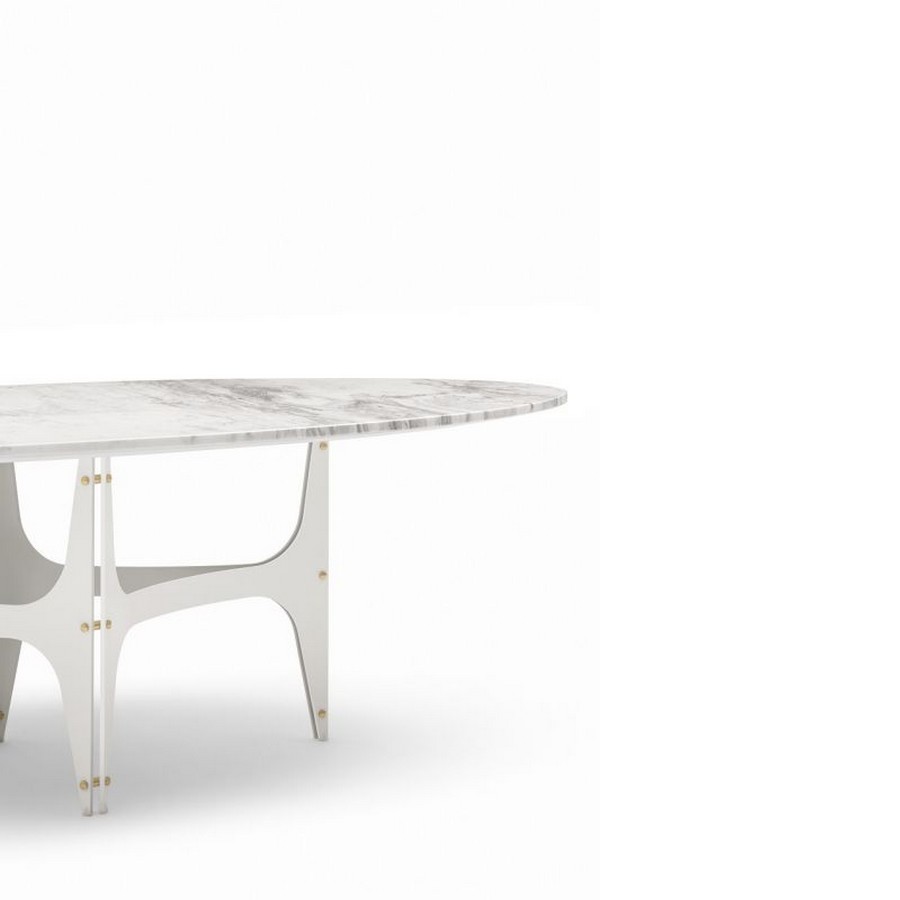 Tavolo fisso rotondo, a botte o rettangolare Universe di Bontempi con struttura in acciaio laccato e dettagli decorativi anch'essi in acciaio laccato in vari colori a scelta. Piano disponibile in numerosi materiali e finiture. Tavolo con basamento in formato unico caratterizzato da elementi decorativi che si trovano tra le varie gambe del tavolo e che possono essere disponibili in diversi colori per evidenziarne la particolarità.