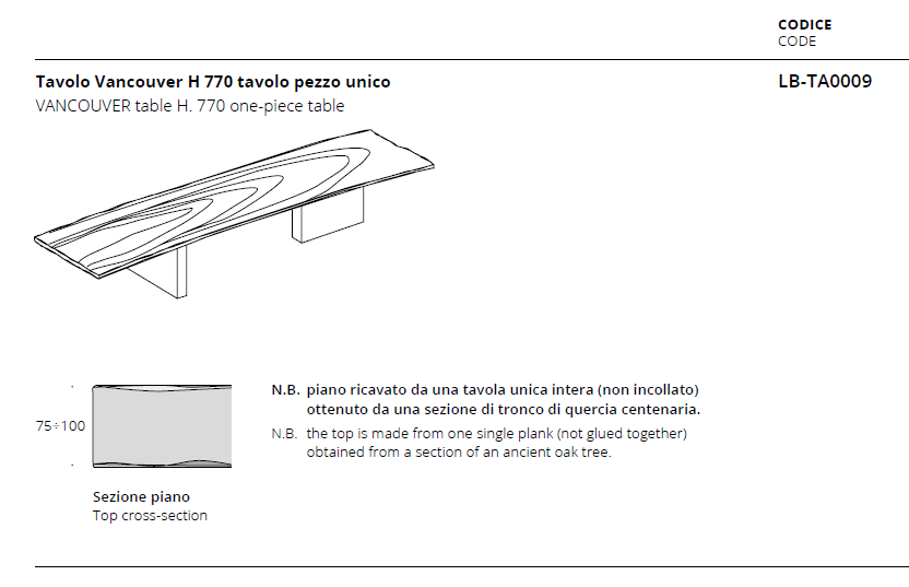 Il tavolo Vancouver è ricavato da tronchi centenari di difficile reperibilità. Nella ricerca della materia prima Altacorte predilige piante già morte ancora erette all’interno dei boschi. Tali legnami hanno delle caratteristiche intrinseche uniche, non replicabili se le stesse fossero tagliate precocemente. Le misure disponibili vengono ricavate da un’unica tavola non incollata che generalmente ha lunghezze variabili da 3 a 9 metri e spessori variabili da 75/100 mm. Le tavole a disposizione di Altacorte variano nel tempo, Altacorte può quindi proporre differenti essenze che vi verranno comunicate in fase di preventivo. Le gambe del tavolo potranno essere definite in fase di preventivazione in base alle caratteristiche della tavola stessa. Eventuali lavorazioni mediante resinature sono da concordarsi in base alla tavola.