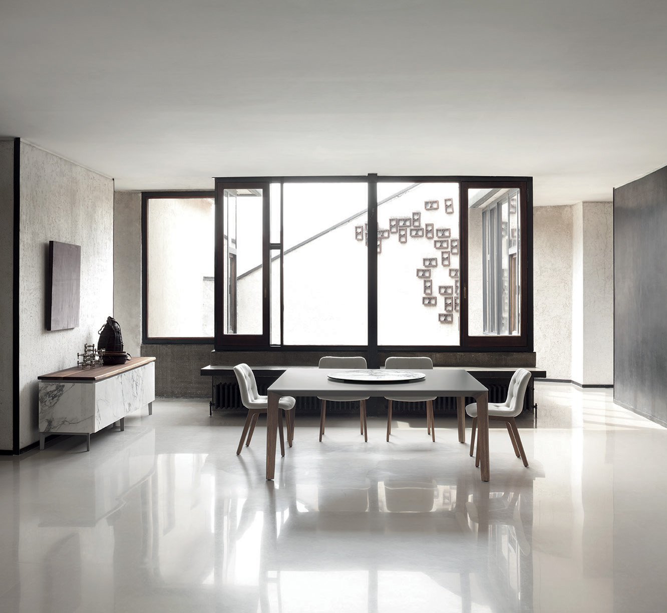 Versus di Bontempi allungabile o fisso, quadrato o rettangolare. Realizzato con struttura in alluminio laccato in tinta con il piano e gambe in legno massello in diverse finiture. Un tavolo di design per arredare con gusto la zona giorno.