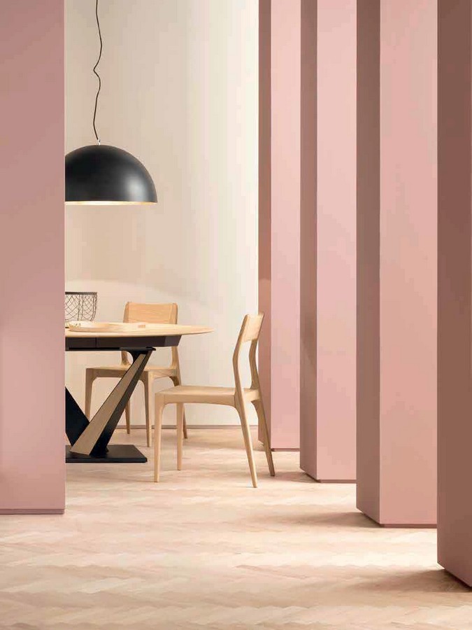 Tavolo allungabile tondo West di Altacorte con sistema di allungamento Book per la versione con piano in legno e Glovo per la versione con piano in ceramica e con basamento in metallo in varie finiture a scelta.
