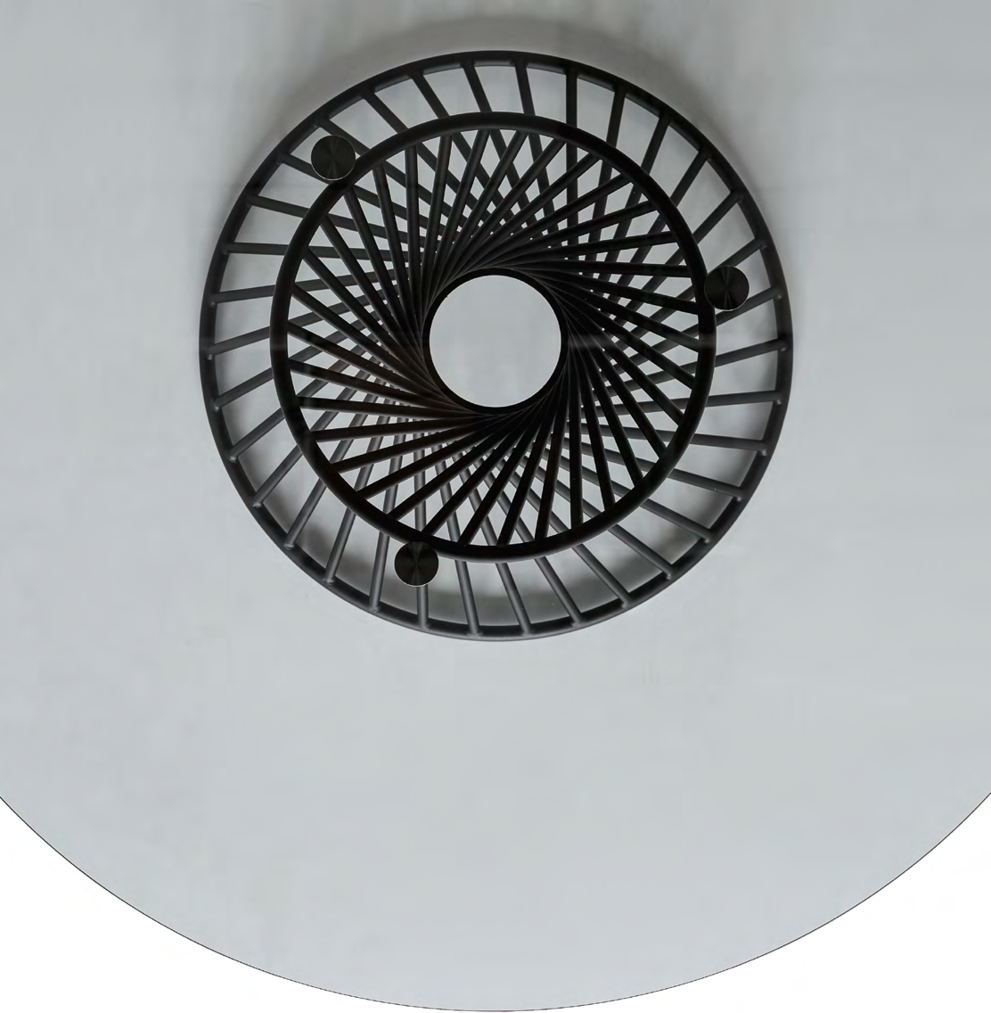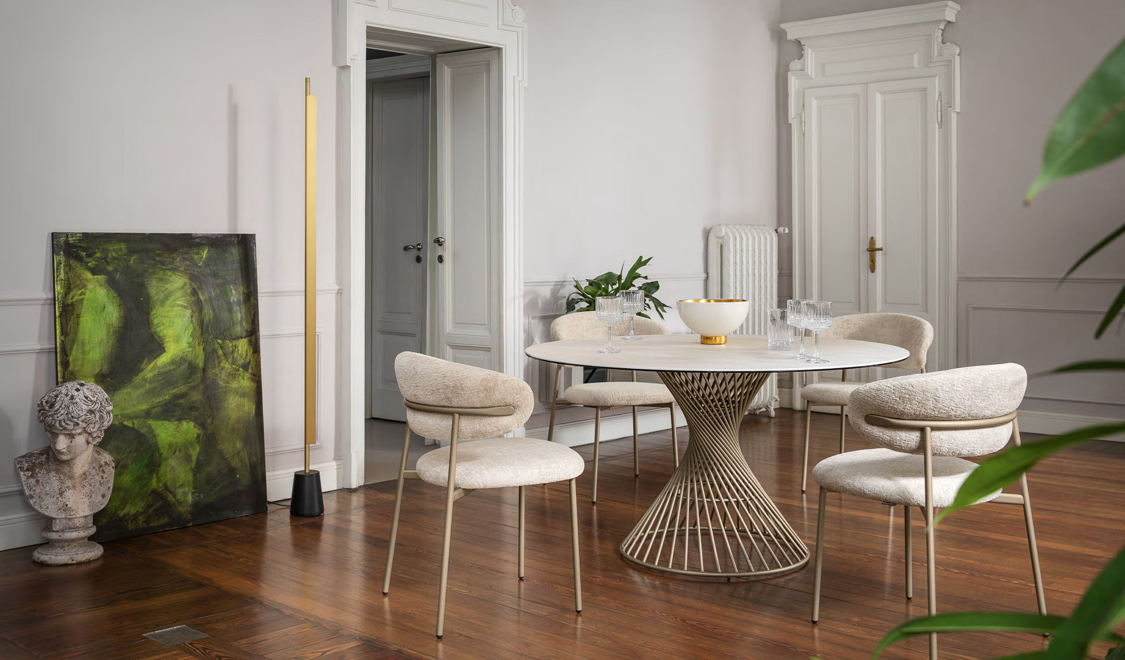 Tavolo VORTEX CS4108 di Calligaris. Vortex è un tavolo rotondo caratterizzato da un fusto centrale in tondino metallico che con il suo andamento elicoidale richiama il movimento dinamico di un vortice d’aria. Una struttura che rimane visibile dall’alto nella versione con piano in vetro, mentre si lascia apprezzare lateralmente nella versione con piano in ceramica.