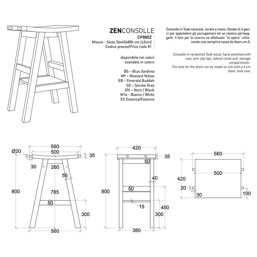 Zen XL CP880ZXL in legno teak recuperato e cerato a mano, gommini antisdrucciolo, barre laterali porta salviette e grande ripiano portaoggetti. I 4 ganci laterali smussati sono perfetti per appendere gli asciugamani. Realizzato artigianalmente senza viti o chiodi.